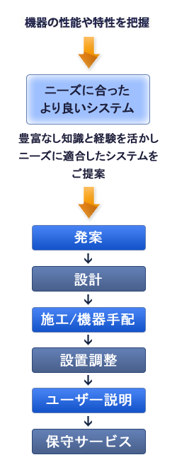お客様のニーズにあわせ、機器の性能を発揮した有効利用ができるよう、設計・設置を実施いたします。